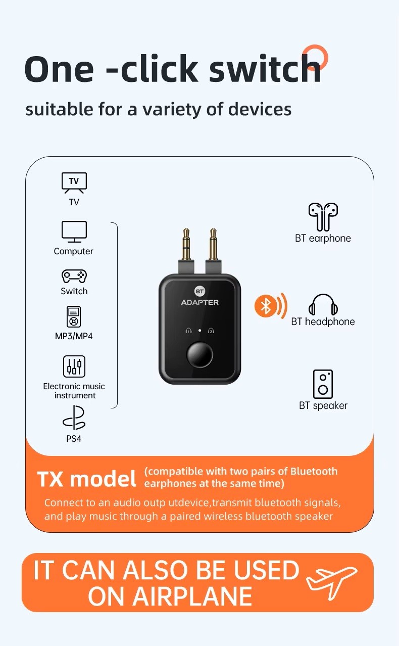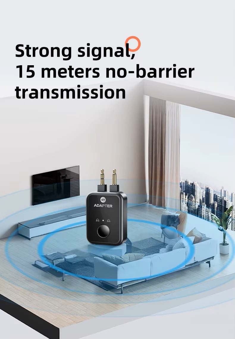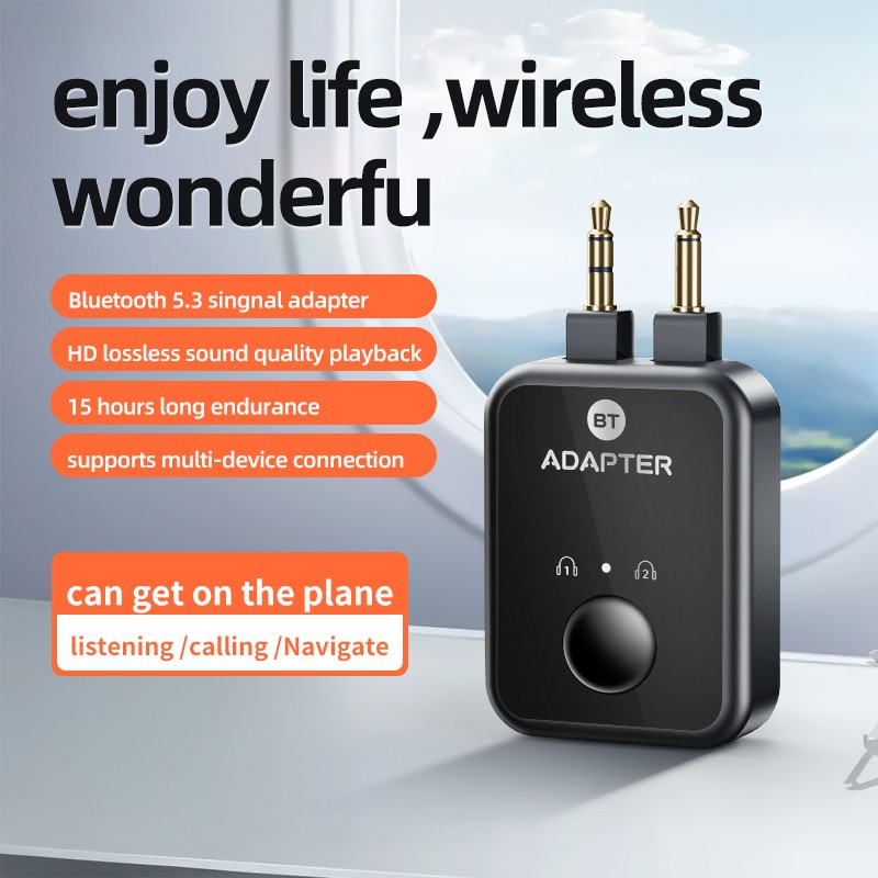 Har du trådløse hovedtelefoner, men flyets skærm kræver AUX-stik? Denne Bluetooth flyadapter løser problemet. Tilslut den til flyets lydudgang og forbind dine Bluetooth-hovedtelefoner på få sekunder.