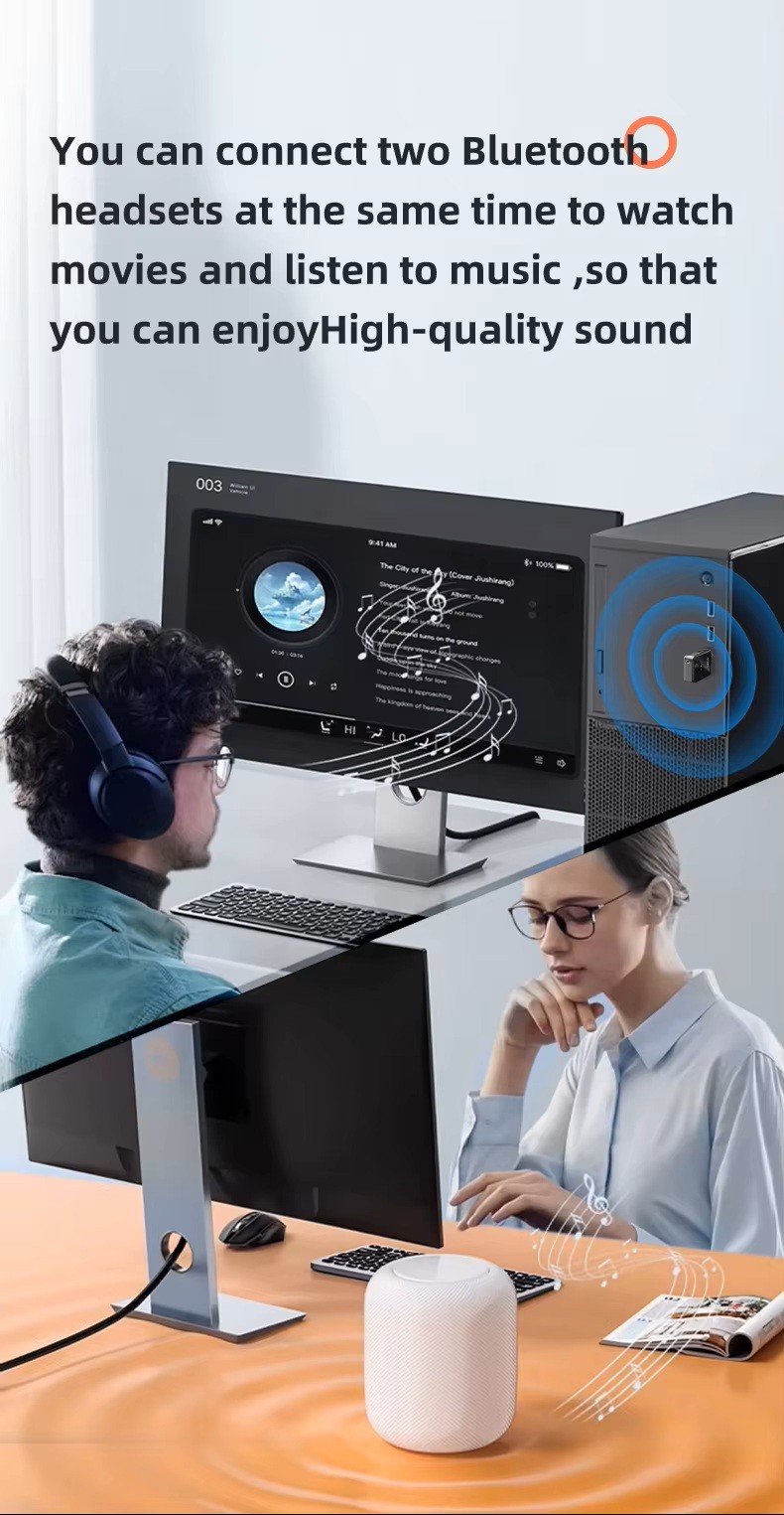 Oplev trådløs lyd på en nem og fleksibel måde med denne Bluetooth 5.3 audio transmitter med 3.5 mm AUX. Adapteren gør det muligt at forbinde to Bluetooth-hovedtelefoner eller højttalere samtidig, så du kan dele lyd fra TV, flyunderholdning, computer eller hjemmeanlæg.