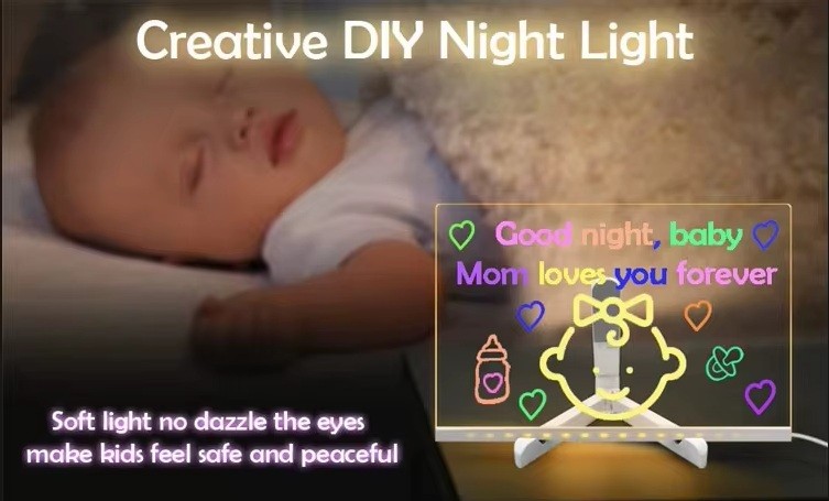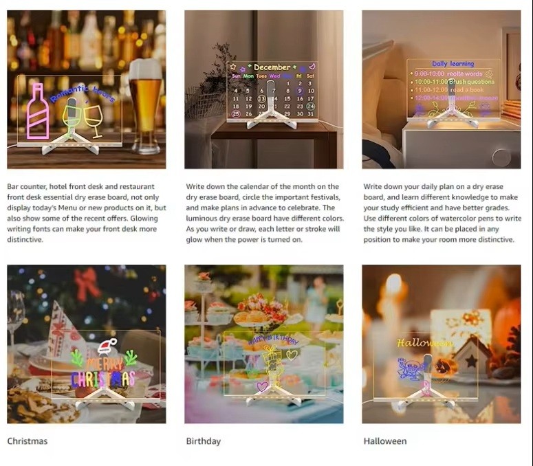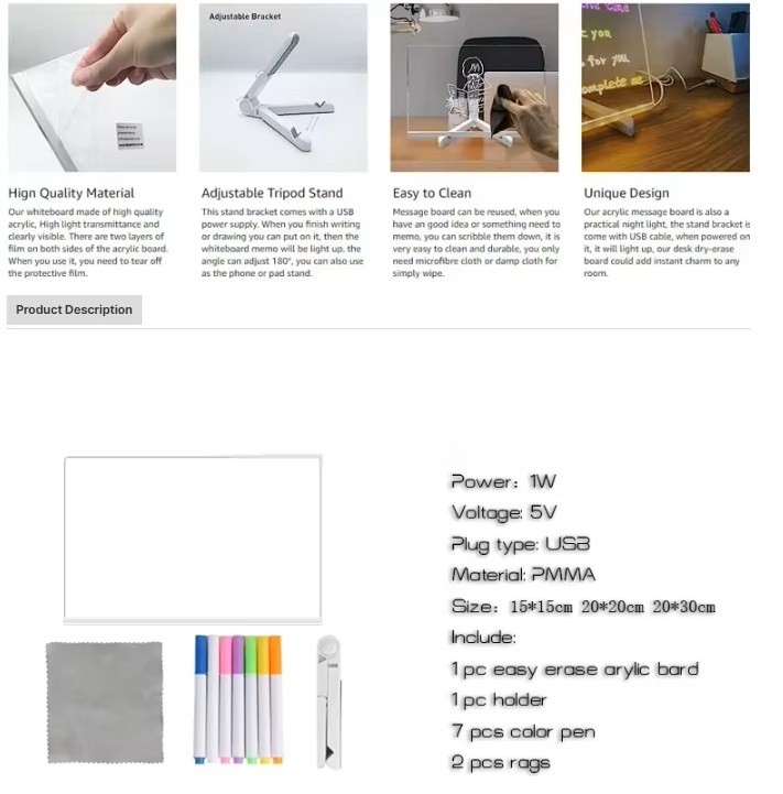 Uanset om du vil skrive huskesedler, tegne små motiver eller lave to-do-lister, giver denne LED-tavle en farverig og inspirerende måde at kommunikere på. Det klare akrylmateriale og de lysende LED-farver skaber et unikt visuelt udtryk, som passer perfekt i både hjem, børneværelse, kontor og butik.