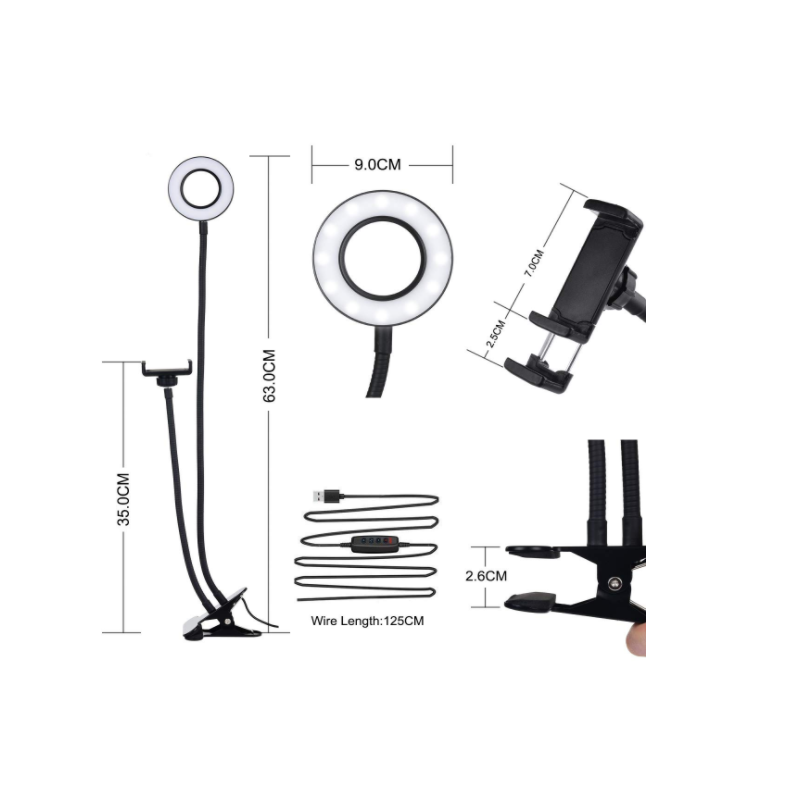 Få professionell belysning var du än är med detta smarta ringljus med clipfäste, flexibel arm och justerbar mobilhållare. Den starka klämman gör det enkelt att fästa lampan på bord, hyllor eller stativ, så att du alltid får den perfekta vinkeln för selfies, TikTok, livestreaming, videomöten, makeup och mycket mer.