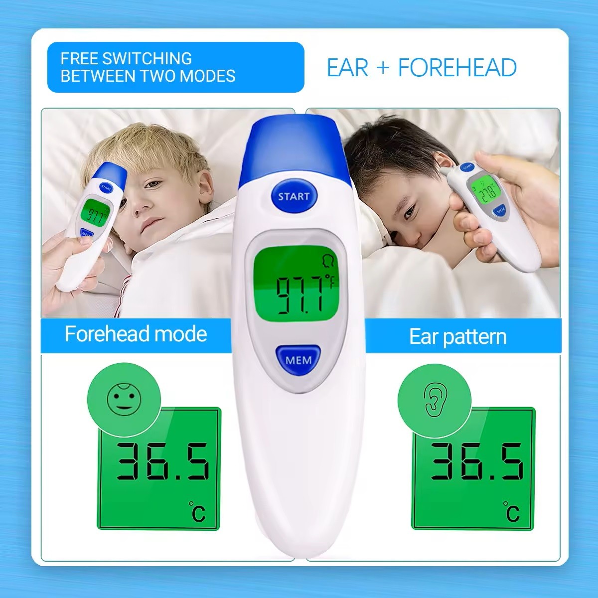 2-i-1 funktion: mäter både i örat och på pannan