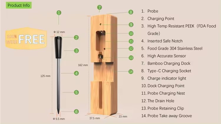 Termometern är utrustad med en avancerad och vattentålig sond (IPX7) som säkerställer noggranna mätningar under alla förhållanden. Snabbladdning på endast 5–10 minuter ger upp till 4 timmars användning – perfekt både till vardag och fest.