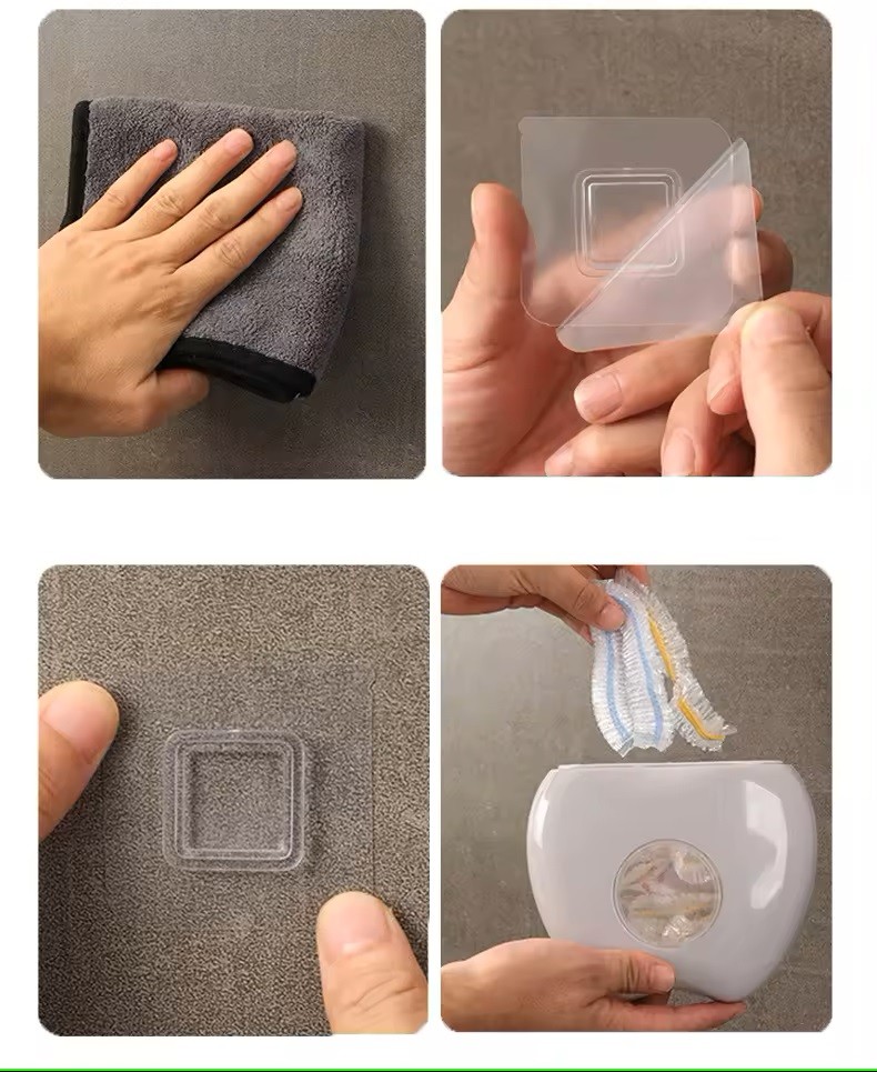 Den medföljande självhäftande väggfästet gör det möjligt att montera behållaren på väggen, vilket sparar plats på bordet och håller plastfolien lättillgänglig. En perfekt kombination av funktionalitet och hygien för modern matförvaring.