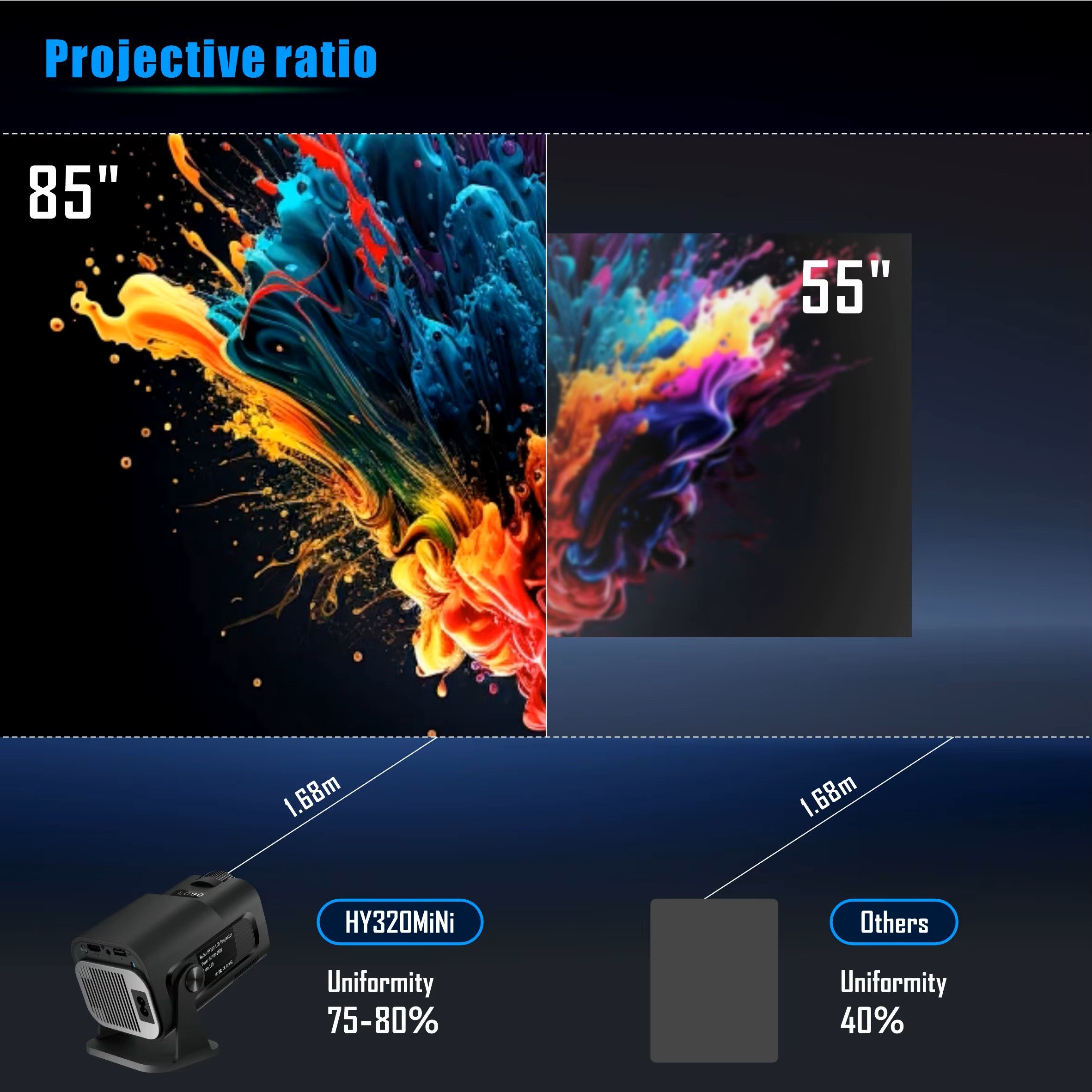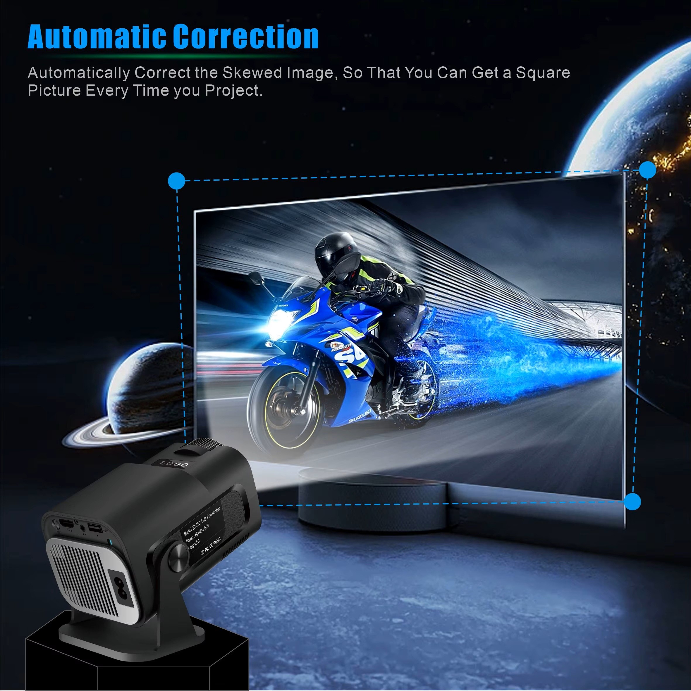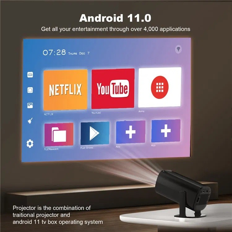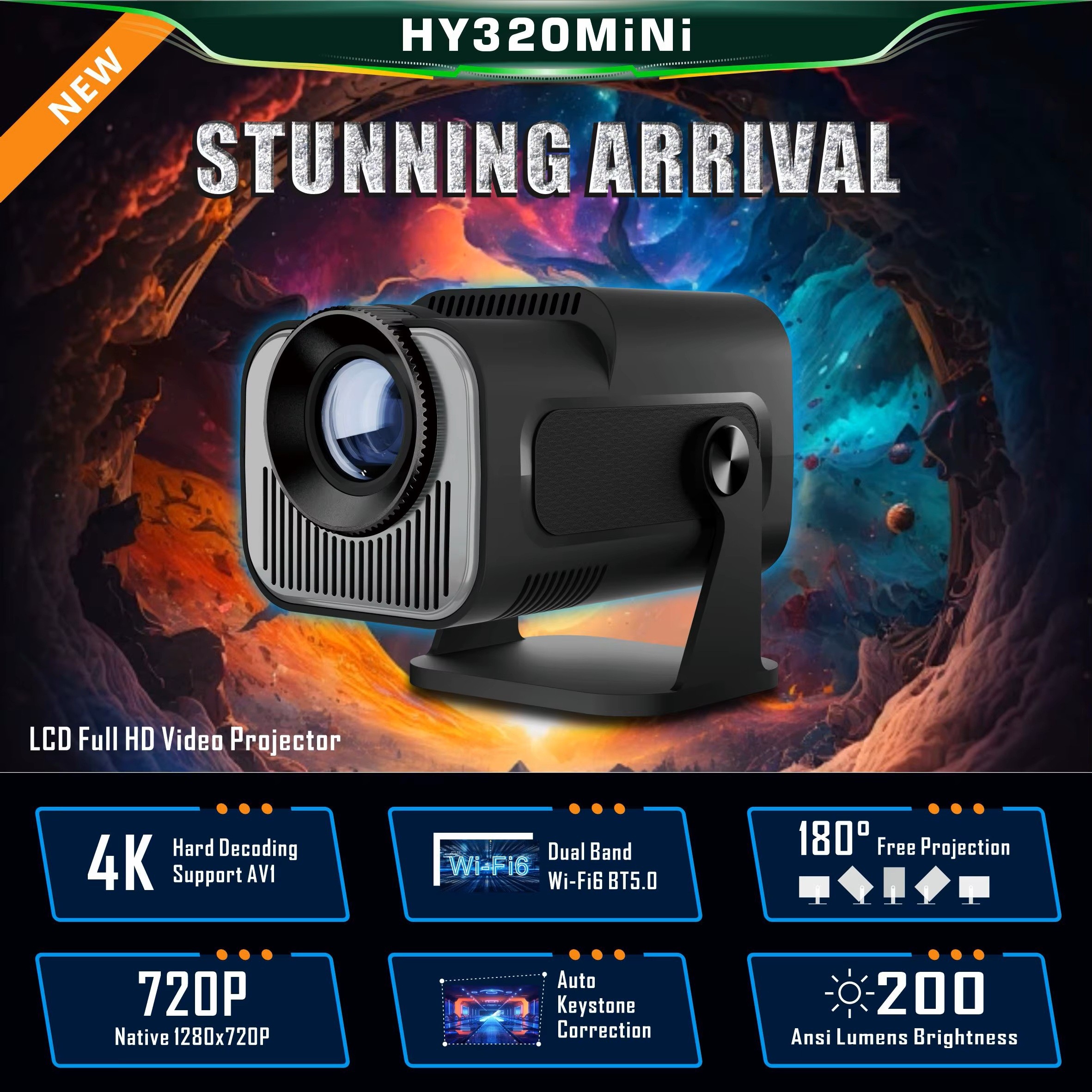 En kompakt 720p HD mini projektor med WiFi 6, Android 11 och automatisk keystone. HY320 ger dig en storbildsupplevelse upp till 150 tum – perfekt för filmkvällar, spel och presentationer.